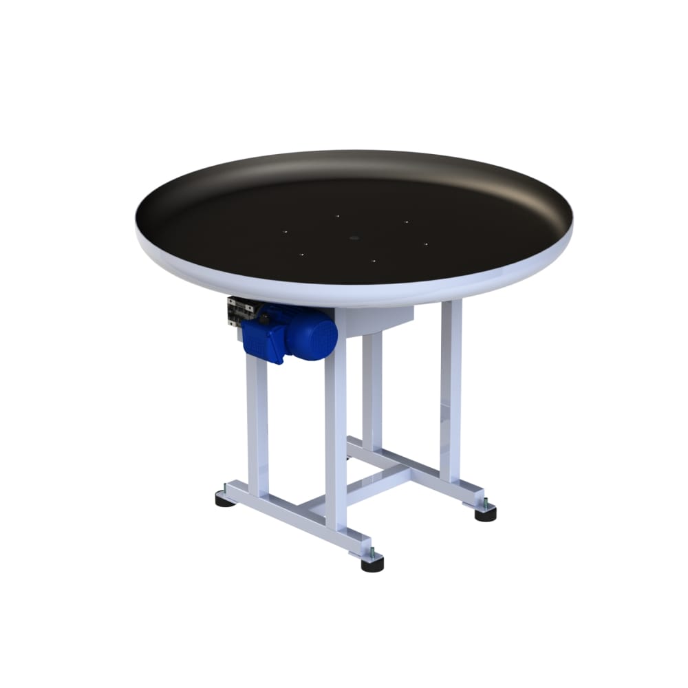 Fabricada em aço carbono SAE 1020 ou aço inoxidável AISI 304, as mesas giratórias são utilizadas para acumular os produtos que saem da empacotadora. Com acionamento através de inversor de frequência, permitem o ajuste da velocidade de rotação, facilitando a operação de embalagem secundária.