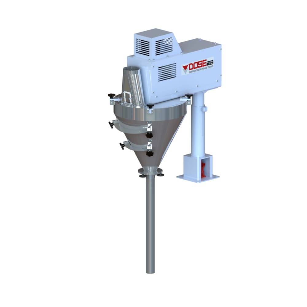 Os dosadores volumétricos de rosca vertical são utilizados para produtos em pó, em processos semiautomáticos ou automáticos. Acionados por servomotor, possuem apoio do pacote, sensor de nível no funil de depósito e CLP para controle preciso de peso. Podem trabalhar com ensacadeiras e empacotadoras.
